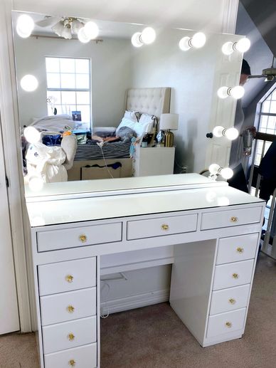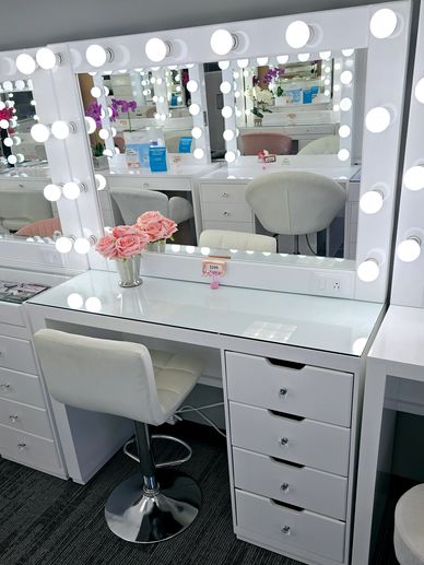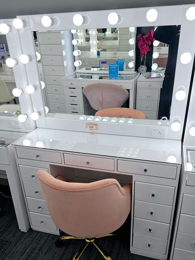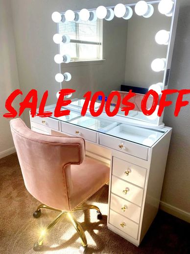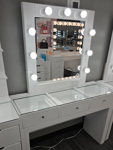 A1- $550 Our ever so classic model is finally back. Featuring 4 Spacious drawers with diamond and handle pull. Large work surface measuring 46"x16". With mirror it's a whopping 66" tall. Mirror features 12 lights with LED bulbs included. Front easy access switch and power outlet .
