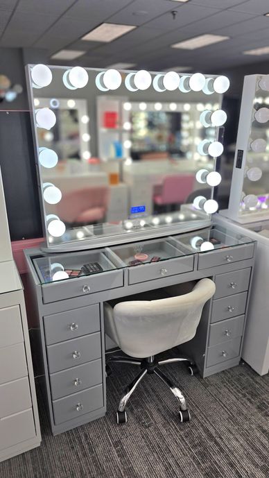 A3-$749 This is the perfect vanity for your room!! This 46x16" amazing vanity features 11 drawers, a clear glass top and a stunning mirror measuring 46xx33". LED bulbs included.