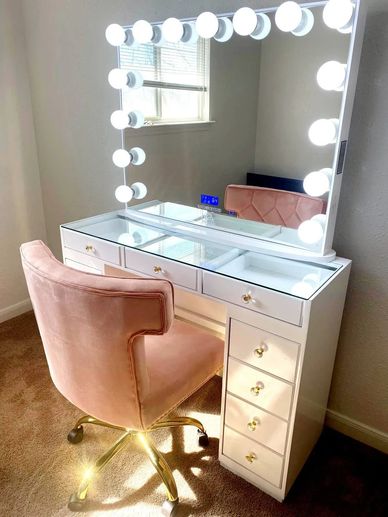 LX-MINI PINK-PINK $899 Part of our latest lineup in vanities! This beauty measures 36x22" and features 6 drawers with beautiful diamond pulls with plenty of storage. Table features color changing lights and USB/C-USB charging ports on the side Mirror features a tempered see through glass and soft close drawers. BLUETOOTH mirror measures 32x27" and has built-in speakers, touch screen dimmer, 2 power outlets, 2 USB outlets and comes with dimmable LED bulbs.